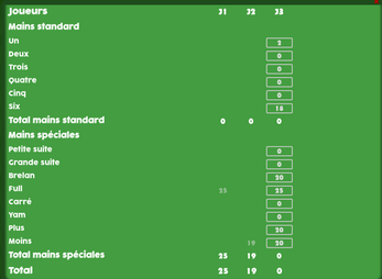 Les règles et les mains sont légèrement différentes du jeu standard. En passant la souris sur le nom d'une main dans la grille des scores, il est possible de voir comment valider cette main et le nombre de points qu'elle rapporte.